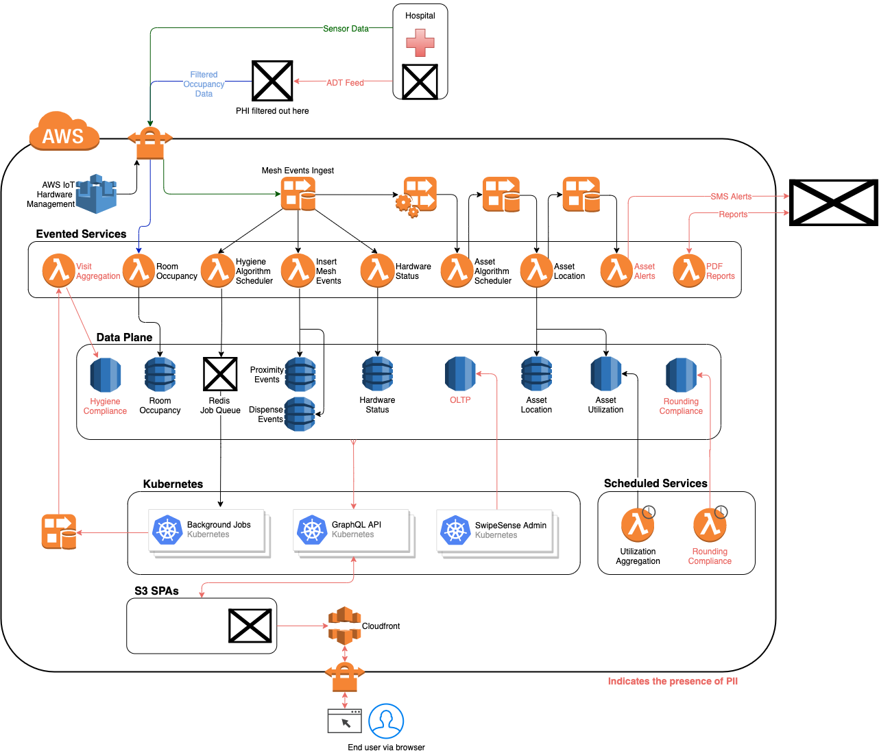 The SwipeSense platform is made up primarily of evented microservices which process data in real time as it comes in from the hardware installed at our client hospitals. It is hosted primarily in the AWS us-east-1 region and relies on only a couple services outside of the AWS ecosystem. The infrastructure is designed to exemplify the following attributes: