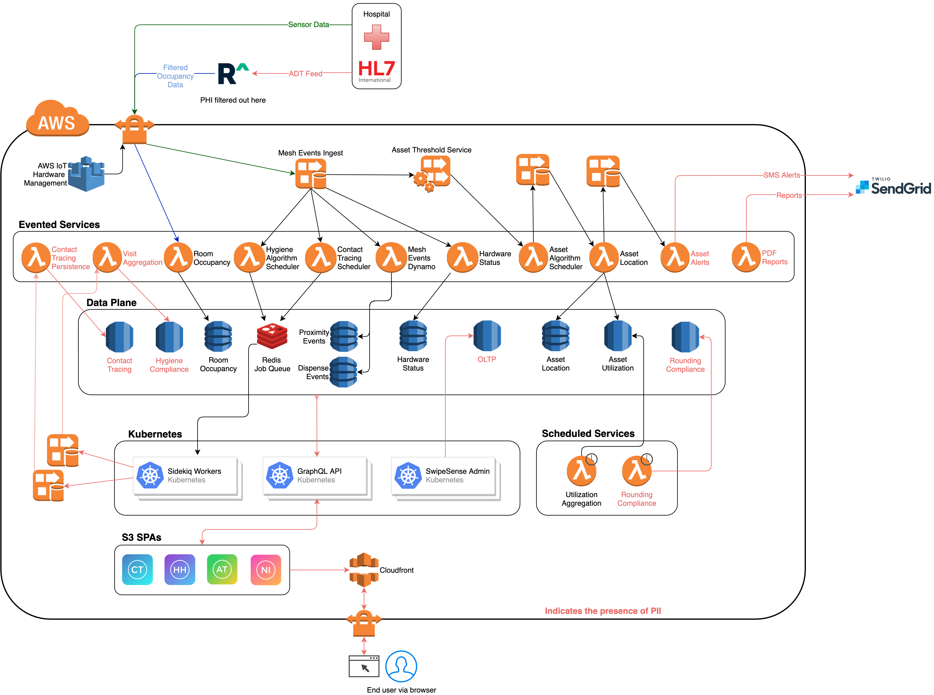 The Hygiene/Contact Tracing Algorithm - This is super important as it is responsible for deriving location and dispenser usage for hand hygiene compliance. More recently (mid 2020), it was augmented with a contact tracing mode to produce visits for all areas of a hospital, not just patient rooms. There are entire articles on this in the Product & Engineering space on confluence. The algorithm runs as Sidekiq jobs, one job per badged user, per unit of time (10 minutes by default). These jobs are queued in the “Redis Job Queue” and are executed in parallel by auto-scaling worker pods within the cluster.