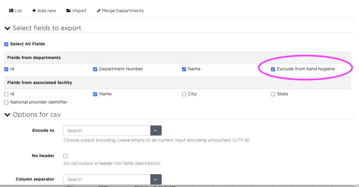 In an attempt to make internal exports easier, we have added a field to the Department Level Exports for Exclude From Hand Hygiene. This field will yield a “True” response if the department has been excluded from HH and a “False” response if the department is participating in hand hygiene. You just need to check the box (Pictured) to populate the column in the .CSV.